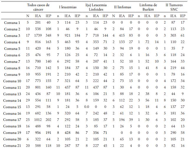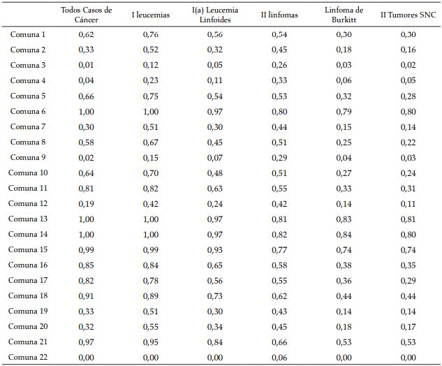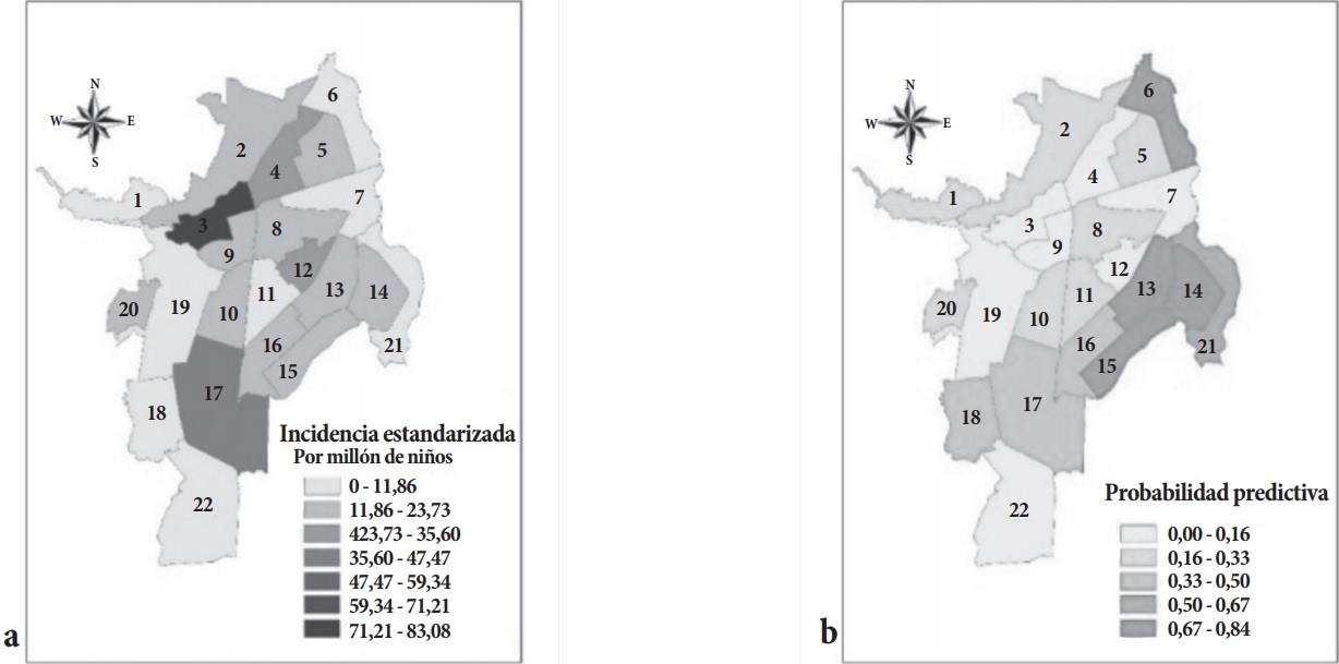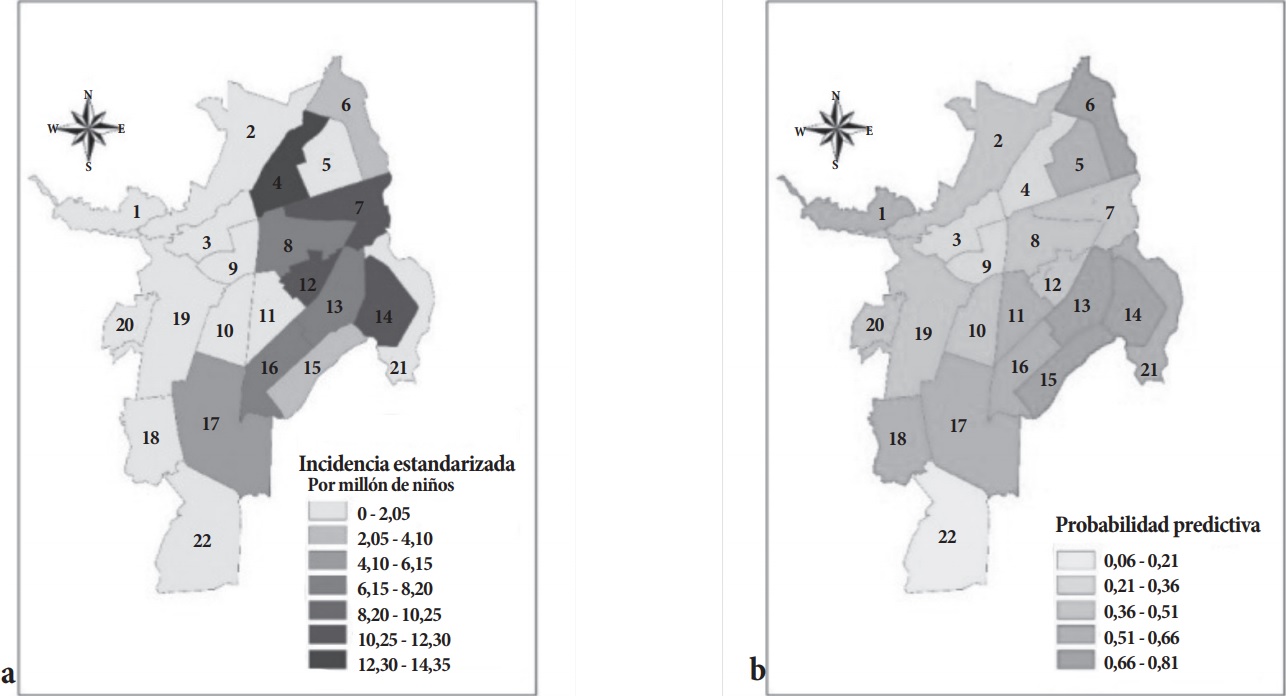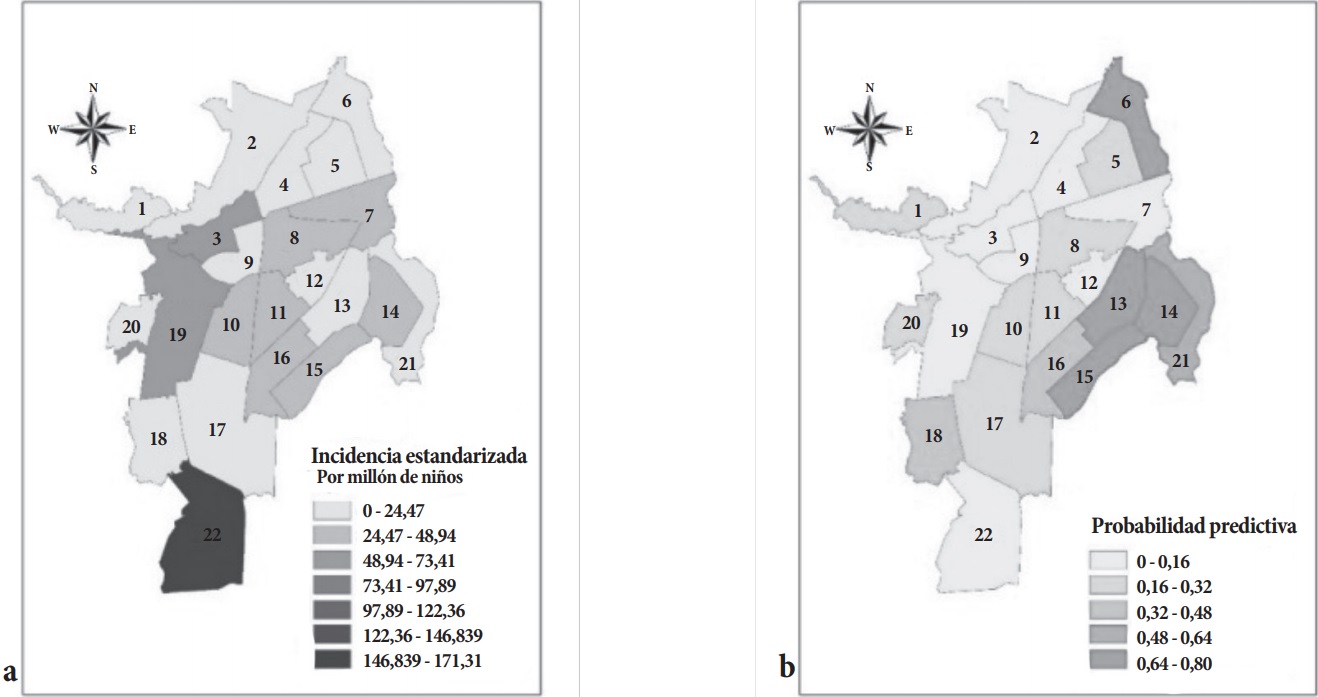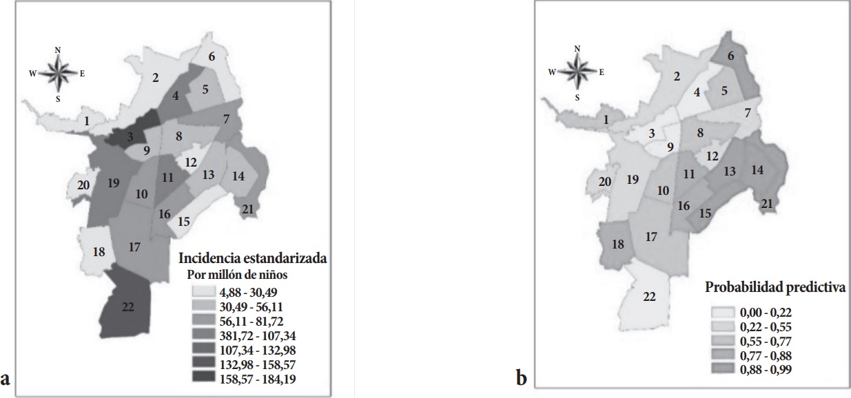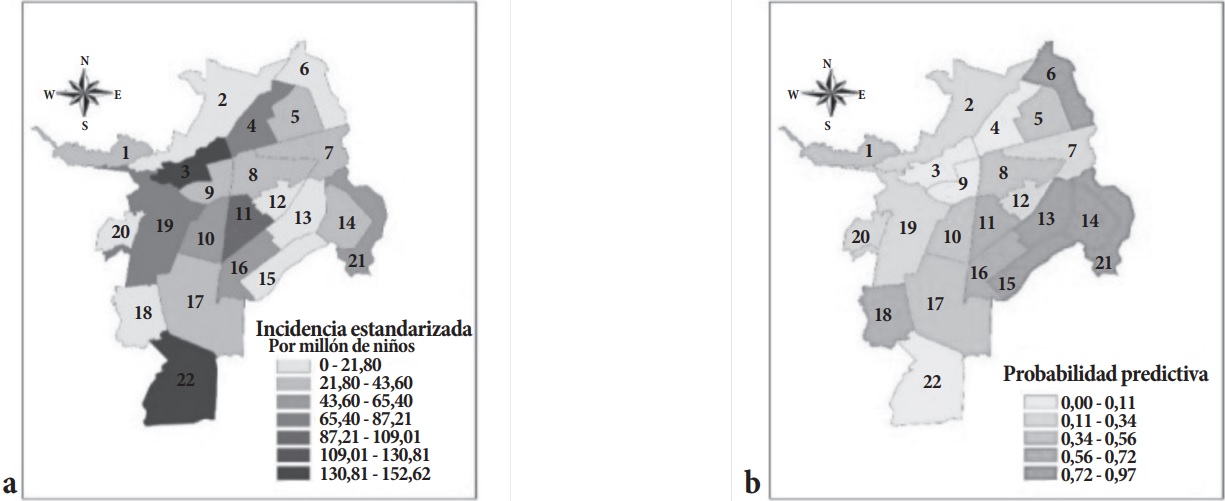 En el periodo de estudio se presentaron 129 casos de leucemia (Grupo i), lo cual representa una tasa de incidencia de 221 por millón de niños y una tasa media de incidencia de 44, siendo la forma linfoide la más común (78,3%). Las mayores cantidades de casos de leucemias se presentaron en las comunas 3, 22, 11 y 19 (incidencias estandarizadas acumuladas de 921, 763, 437 y 428, respectivamente). Por otro lado, las menores incidencias estandarizadas acumuladas se presentaron en las comunas 2 y 15 con 46 y 24 casos por millón de niños (tabla 2). En la comuna 22, la probabilidad predictiva de encontrar cinco o más casos de leucemia en los próximos cinco años es aproximadamente cero, mientras que en las comunas 6, 13, 14 y 15 dicha probabilidad es casi 1 (tabla 3 y Figura 2a-b).