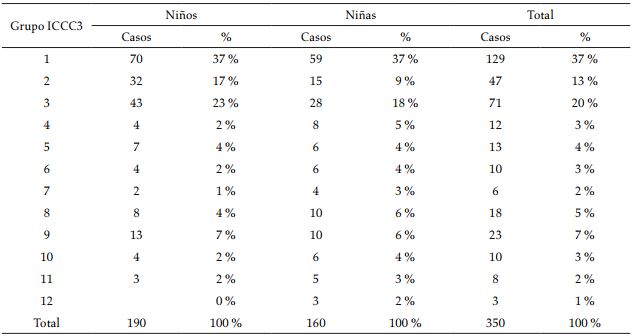 Entre el periodo analizado, 2009-2013, en casco urbano de Santiago de Cali se presentaron 350 casos nuevos de cáncer en la población infantil, lo cual representa una incidencia de 606 casos por cada millón de niños y una incidencia media por año de 121 casos (tabla 2). De acuerdo con la Clasificación Internacional de Cáncer Infantil (ICCC), el 37% de los casos corresponden a leucemias (Grupo i), el 23% a tumores sólidos (Grupo iii) y el 17% a linfomas (Grupo ii). El 54% de los casos corresponden a varones y en general el 42% son menores de 5 años (tabla 3).