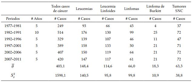 casos de cáncer infantil para la ciudad en seis periodos de cinco años. Con