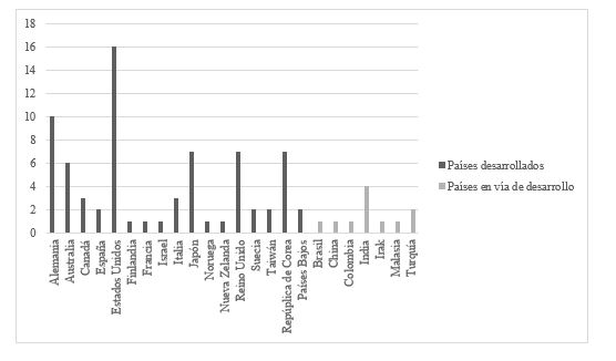 La mayor producción de publicaciones se concentra en los países desarrollados (72 artículos) y la menor, en países en vías de desarrollo (11 artículos). El país que reporta un índice más alto sobre indicadores pronóstico en disfagia luego de un ACV es Estados Unidos (16 publicaciones) y el de mayor producción en países en vías de desarrollo es la India (4 publicaciones); sin embargo, la diferencia en número de artículos publicados entre estos dos es amplia. La figura 2 presenta estos hallazgos.