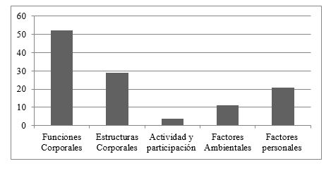 Las variables pronóstico halladas en la búsqueda y revisión sistemáticas fueron organizadas en una matriz, usando como ordenador los constructos de la CIF: factores personales, funciones corporales, estructuras corporales, factores ambientales, actividades y participación. La figura 3 permite visualizar que las variables relacionadas con aspectos endógenos del individuo (funciones y las estructuras corporales) ocupan el grueso de la investigación sobre prognosis en disfagia seguida de ACV, en comparación con dimensiones relacionadas con las actividades y la participación, y los factores contextuales (personales y ambientales).