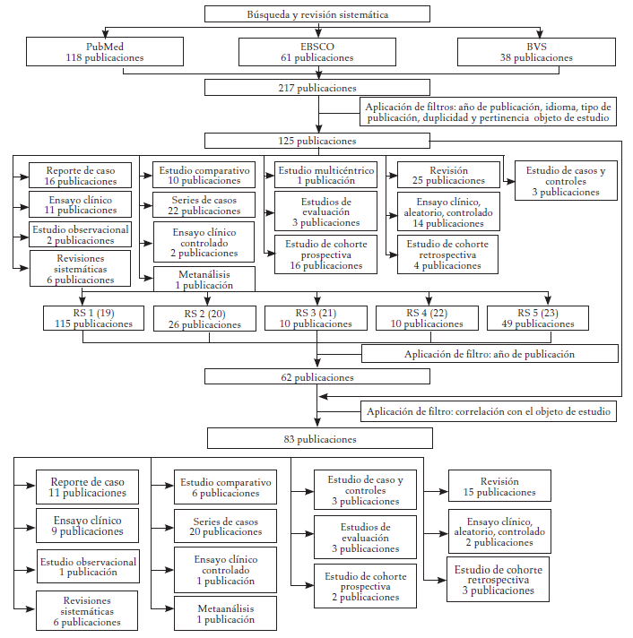 El presente estudio emplea la búsqueda y revisión sistemáticas, por cuanto representan un proceso comprensivo cuyo resultado es la síntesis de la mejor evidencia disponible; considera múltiples tipos de estudio y provee un cuadro más completo de las tendencias de investigación en un tópico particular (17). Las bases de datos empleadas para conducir la búsqueda fueron PubMed, ebsco y Biblioteca Virtual en Salud (BVS).