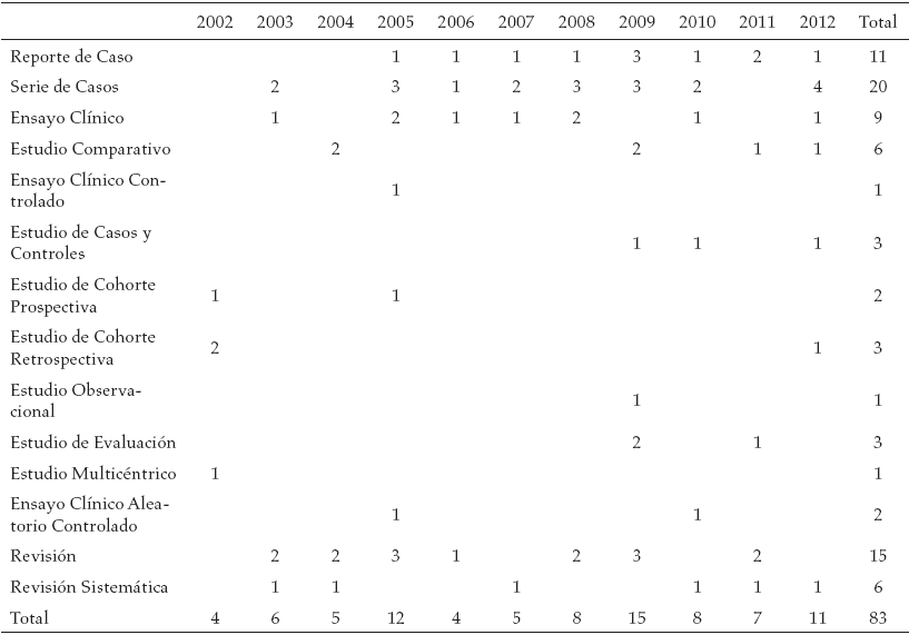 Como puede observarse en la tabla 2, la menor producción de publicaciones en indicadores pronóstico y disfagia se realizó en el año 2002 y 2006, mientras que la mayor se registró en el año 2009; de lo cual se puede afirmar que se ha incrementado el interés por abordar este tópico en los últimos años. De los estudios primarios prevalecen las series de casos, y como parte de los estudios secundarios las revisiones. Lo anterior, quizás se debe a la complejidad metodológica que presuponen los estudios tipo ensayo clínico y a la heterogeneidad con la que se presenta el ACV y la disfagia.
