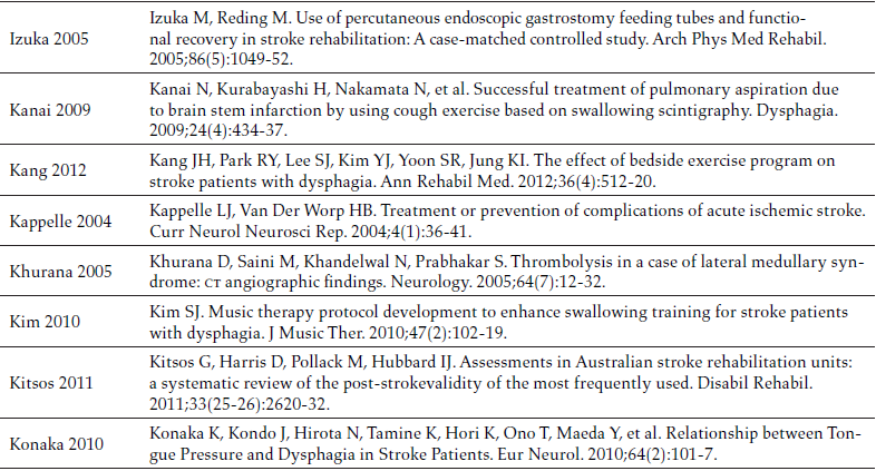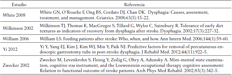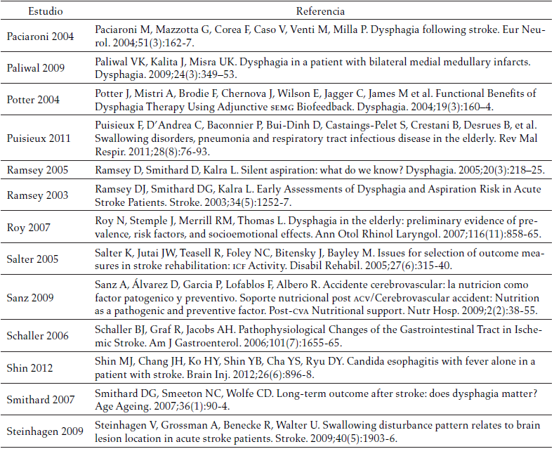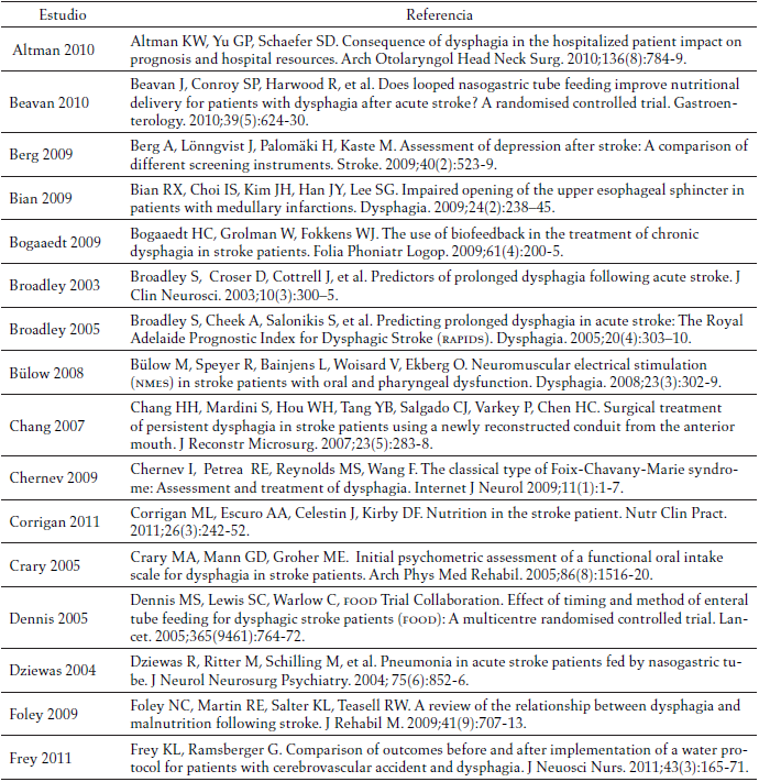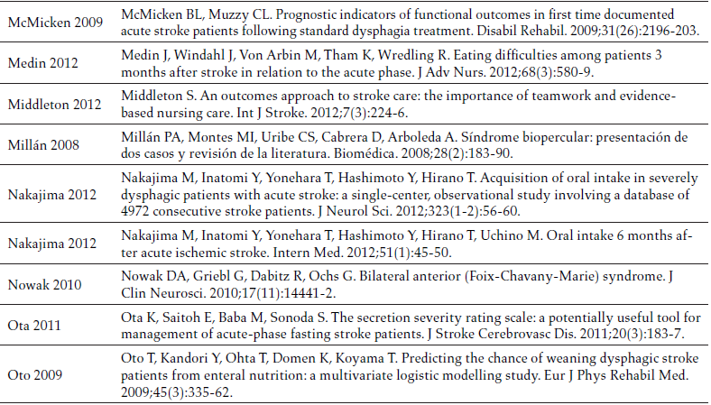 Para las dos primeras se utilizó la sintaxis en inglés [(dysphagia) AND (stroke) AND (prognosis)], mientras que para la tercera se condujo la búsqueda en español [disfagia AND accidente cerebrovascular AND pronóstico]. Los límites de búsqueda fueron publicaciones en un periodo de 10 años (2002-2012), investigaciones con seres humanos, mayores de 19 años, estudios pertenecientes al área de la salud y publicaciones arbitradas. La fecha de búsqueda fue el 29 de marzo de 2013.