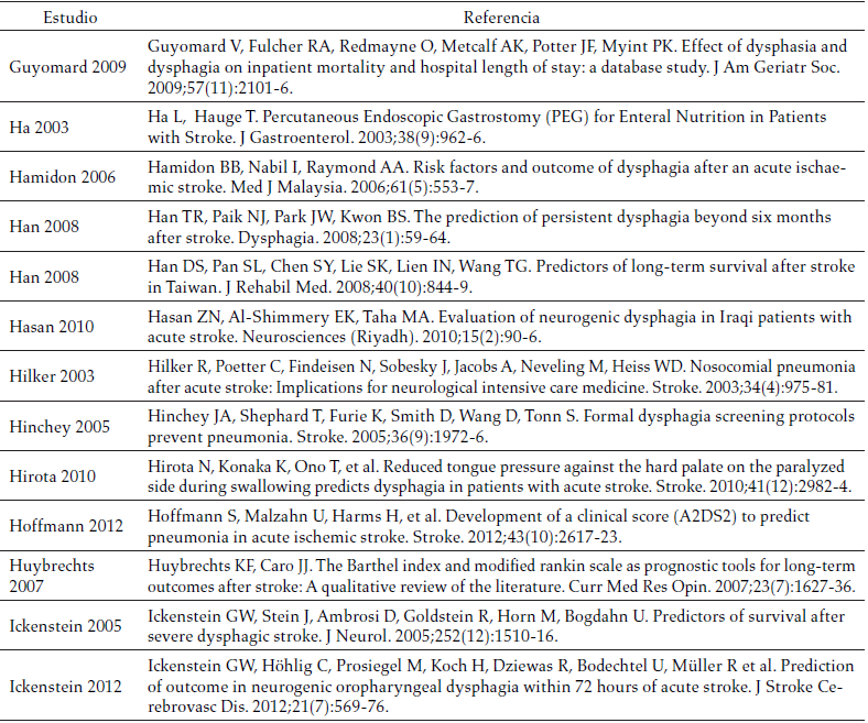Reconociendo que una revisión sistemática dirigida a examinar los factores pronósticos de disfagia en pacientes afectados de una lesión vascular cerebral debería preferir estudios de cohorte y análisis de riesgos relativos o de razones de riesgo, la información existente y disponible para análisis se caracteriza por su heterogeneidad, la multiplicidad de diseños —en especial las series de casos expuestos—, lo que impide un proceso más robusto de estimación de efecto de riesgo y conclusiones de mayor validez. En consecuencia, se han incluido en esta revisión documentos publicados, relativos a la pregunta de interés y con una aceptable calidad de conducción y presentación de resultados, a fin de no sacrificar información relevante.
