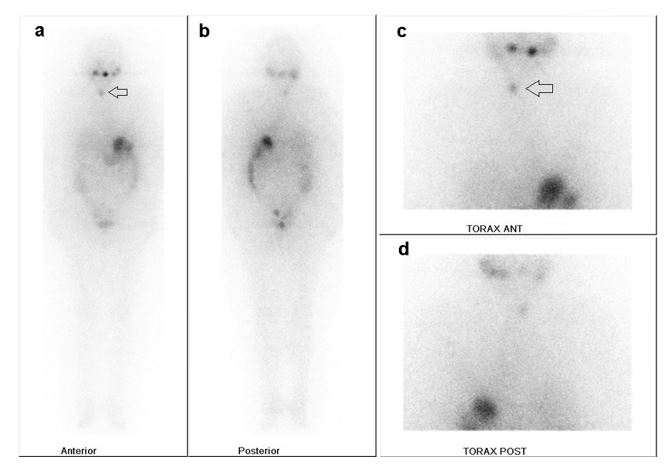 Se muestra imagen de cuerpo completo en proyecciones anterior (a) y posterior (b) donde se observa distribución normal del I-131 por glándulas salivares hipercaptantes y presencia por saliva radiactiva en boca. Existen escasa actividad hepática y en tracto gastrointestinal. La flecha señala la adenopatía cervical en fase de irradiación. Imágenes sectoriales en proyecciones anterior (c) y posterior (d) de región de interés. La flecha señala la adenopatía cervical en fase de irradiación.