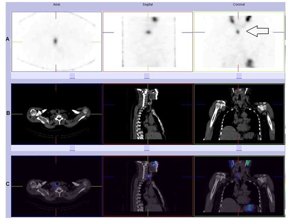 Figura 2. A: Imágenes en planos axial, sagital y coronal de spect. La flecha en detalle apunta al tejido tiroideo en fase de irradiación. B: Imágenes en planos axial, sagital y coronal de ct. C: Imágenes en planos axial, sagital y coronal de fusión spect-ct.