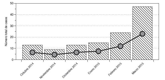 Durante el periodo de 6 meses de estudio, la mayor proporción de los casos (58,6 %) se presentaron en los meses de febrero y marzo (figura 1).