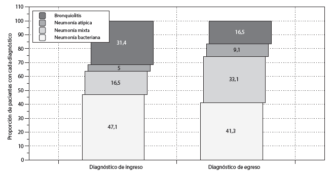 En orden de frecuencia los diagnósticos de ingreso fueron: neumonía bacteriana (57 pacientes, 47,1 %), bronquiolitis (38 pacientes, 31,4 %), neumonía mixta (20 pacientes, 16,5 %) y neumonía atípica (6 pacientes, 5 %). Al ingreso a urgencias 25 pacientes (20 %) presentaron clínica de sepsis y 7 pacientes (5,8 %) choque séptico. En contraste, los diagnósticos al egreso fueron: neumonía bacteriana (50 pacientes, 41,3 %), neumonía mixta (40 pacientes, 33,1 %), bronquiolitis (20 pacientes, 16,5 %) y neumonía atípica (11 pacientes, 9,1 %) —figura 2—. El grado de acuerdo entre el diagnóstico al ingreso y al egreso fue clasificado como moderado (kappa p=0,5).