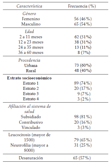 La edad promedio de los pacientes fue de 1,7 años, 65 eran de género masculino (54 %). El grupo etario predominante fueron los lactantes, 100 niños (82 %); 101 (84 %) pertenecían al régimen de salud subsidiado o vinculado, y el 60,3% procedían del área urbana —predominaron los estratos 1 y 2 (90,1 %)— (tabla 1).