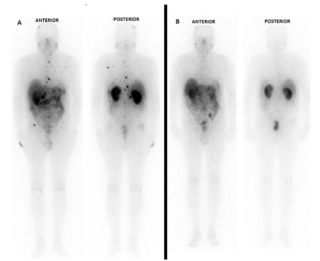 A. Rastreo posterapia de primera dosis de 177Lu-Dotatate. Se muestran imágenes de cuerpo completo en proyecciones anterior y posterior, en las que se observan lesiones hipercaptantes y patológicas en múltiples localizaciones a nivel supra e infradiafragmático en fase de irradiación. B. Rastreo posterapia de tercera dosis de 177Lu-Dotatate (dosis total acumulada de 24 GBq). Se muestran imágenes de cuerpo completo en proyecciones anterior y posterior sin que se observen lesiones hipercaptantes que se puedan considerar patológicas. Desaparecieron todas las lesiones hipercaptantes observadas en el rastreo posterapia de la primera dosis. Junto con hallazgos en pruebas morfológicas y bioquímicas se considera respuesta completa al tratamiento.