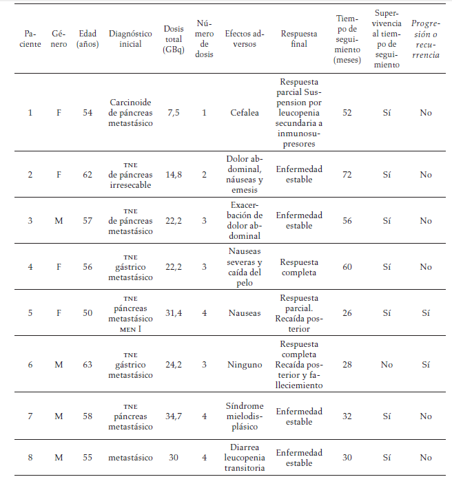 En total se incluyeron 8 pacientes (4 mujeres y 4 hombres). Los tratamientos se realizaron desde 2009 hasta marzo de 2016. Se administraron un total de 24 dosis con un promedio de 3 dosis por paciente y un total de 187 GBq (5054 mCi) de 177Lu-Dotatate y una dosis promedio de 23,5 GBq (635 mCi) dosis/paciente [7,4-34,7 (200-939 mCi)] (tabla 1).
