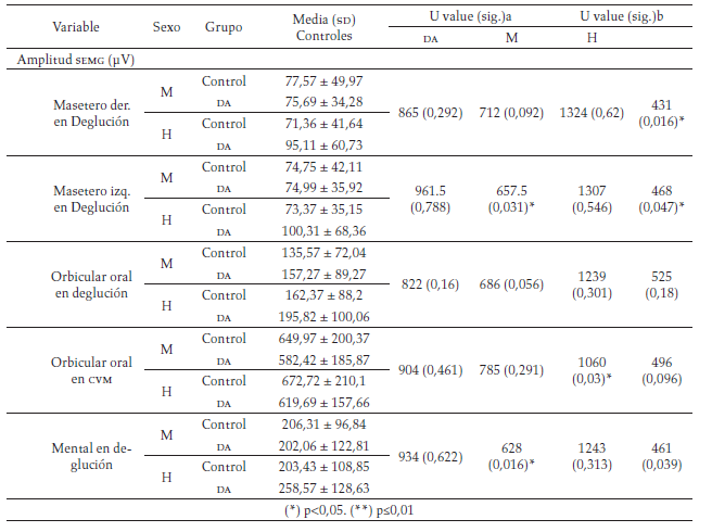 En los niños las amplitudes del registro SEMG de los músculos mental y maseteros fueron significativamente mayores en el grupo con DA respecto a los controles. La amplitud de la contracción voluntaria máxima del orbicular de los labios fue significativamente menor en las niñas con DA que en las niñas del grupo control. Las amplitudes del registro SEMG estudiadas no difieren entre los niños y las niñas del grupo control (tabla 2).