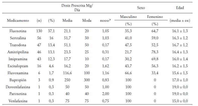 Se evaluaron un total de 350 adolescentes con alguna prescripción de un fármaco antidepresivo, la edad media fue de 16,3 ± 1,4 años, con un ligero predominio del sexo femenino con 209 casos (59,7 %). Los pacientes de la muestra evaluada fueron atendidos principalmente en las ciudades de Manizales (n=74; 21,1 %), Ibagué (n=59; 16,9 %), Pereira (n=55; 15,7 %), Barranquilla (n=41; 11,7 %), Cartagena (n=34; 9,7 %), Bucaramanga (n=29; 8,3 %) y otras 12 ciudades alrededor del país que completan los restantes 58 pacientes (16,6 %)