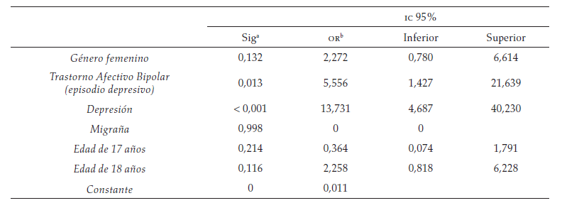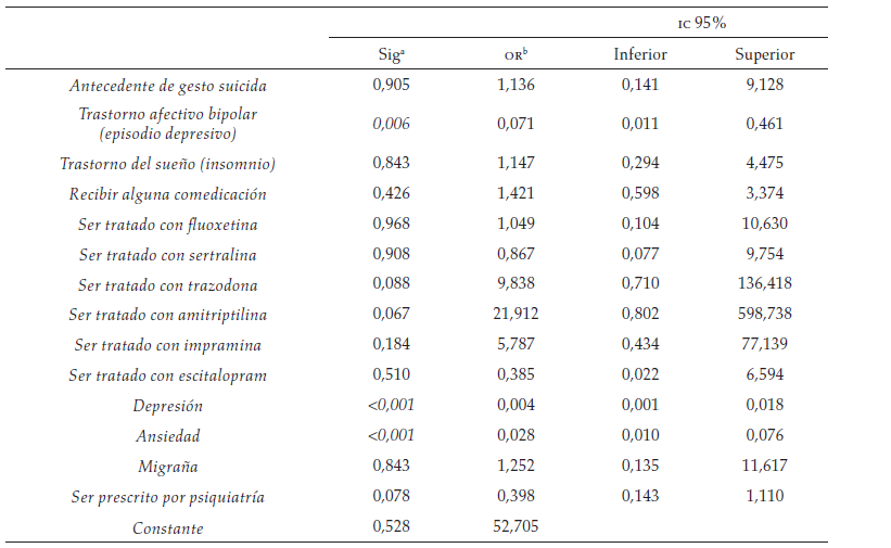 El análisis multivariado entre las diferentes variables y el reporte de gestos suicidas mostró que tener el diagnóstico de depresión o de trastorno afectivo bipolar durante el episodio depresivo se asociaron de forma estadísticamente significativa con una mayor probabilidad de presentar algún gesto suicida. Ninguna variable se asoció con reducción de este riesgo (tabla 2).