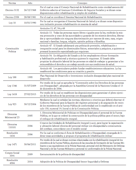 26. Colombia, Ministerio de Defensa Nacional. Política de Discapacidad del Sector Seguridad y Defensa [internet]. 2014 [citado 2016 may 12]. Disponible en: http://www.disanejercito.mil.co/index.php?idcategoria=29653