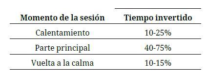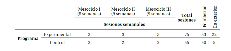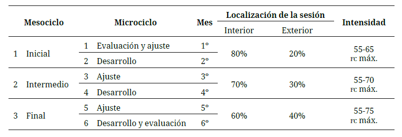 Los ejes fundamentales de la intervención estuvieron apoyados en la distribución temporal del tiempo de práctica (tabla 4); control diario del esfuerzo; búsqueda de la significatividad de las actividades; sucesión variada y adaptada de contenidos; potenciación del aprendizaje motriz e interacción social desde las habilidades conocidas a las novedosas; aumento de la implicación activa de las participantes a través de sus decisiones; y utilización del entorno como espacio de práctica protagonista. Se comenzó con una frecuencia de tres sesiones semanales de 45 minutos (mesociclo I), aumentando progresivamente hasta los 70 minutos de duración (mesociclo III) (48).
