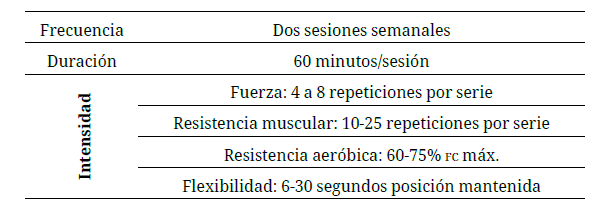 Se siguieron directrices utilizadas para actividad física con mayores con respecto a la temporalización (≥20 semanas), frecuencia (≥3 sesiones/semana), duración de cada sesión (30-60 minutos), y control progresivo de intensidad y descanso (41, 43, 46, 47).