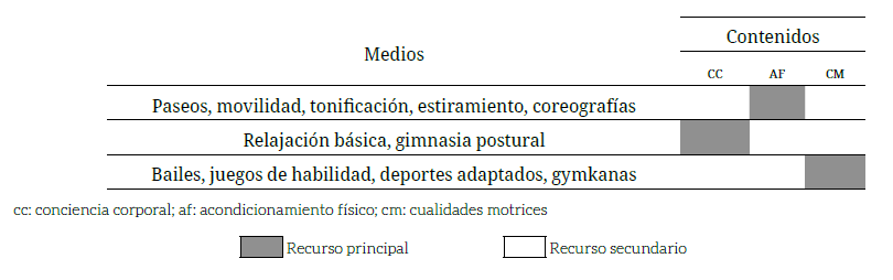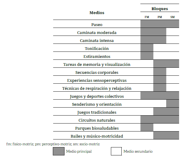 Se utilizaron de forma combinada los medios para incrementar la riqueza de las tareas a medida que avanzaban las sesiones, reforzando la potencialidad física, perceptiva o social a través del movimiento, provocando situaciones multifactoriales, y variando las localizaciones interiores y exteriores regularmente (tabla 5).