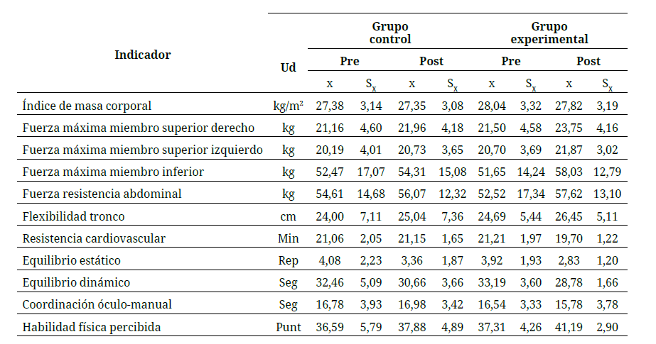 Para la valoración de la condición físico-motriz se eligieron diez indicadores sobre las dimensiones antropométrica, física y motriz. Además, se evaluó la percepción subjetiva de cada participante sobre su propia habilidad física.
