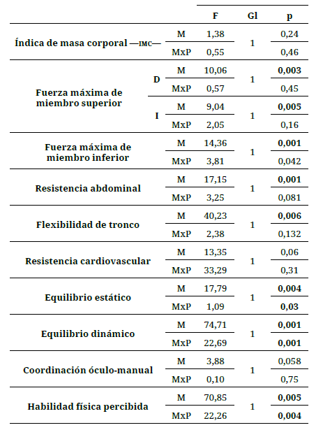 Por su parte, se confirmaron diferencias estadísticamente significativas entre los programas control y experimental para las variables equilibrio estático, equilibrio dinámico, fuerza máxima de miembro inferior y habilidad física percibida, recogiéndose en todas ellas avances más favorables en el grupo experimental (tabla 8).