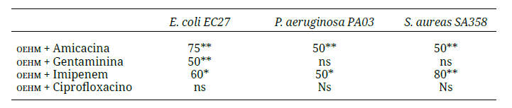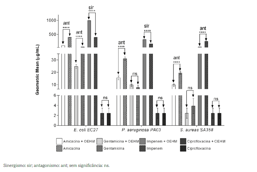 Ao investigar a atividade moduladora, observou-se que quando se associou o OEHM com o antibiótico amicacina houve um efeito antagônico contra as três bactérias utilizadas no teste, Staphylococcus aureus (SA358), Escherichia coli (EC27) e Pseudomonas aeruginosa (PA03), em 50%, 75% e 50%, respectivamente. Da mesma forma o efeito antagônico foi observado em associação com o antibiótico Gentamicina, onde ocorreu uma redução no número de morte das bactérias EC27 em 50%. Por outro lado, não foi observado significância dessa associação frente à SA358, como também à PA03. Quando o OEHM foi combinado com imipenem, diferentemente dos resultados anteriores, apresentou sinergismo frente as cepas de EC27 e PA03 diminuindo em 60% e 50%, respectivamente, a CIM. Entretanto, frente a cepa de SA358 a associação do OEHM com o imipenem mostrou efeito antagônico aumentando em 80% a CIM. O OEHM também foi associado com o antibiótico ciprofloxacino, onde não mostrou significância em relação ao controle.