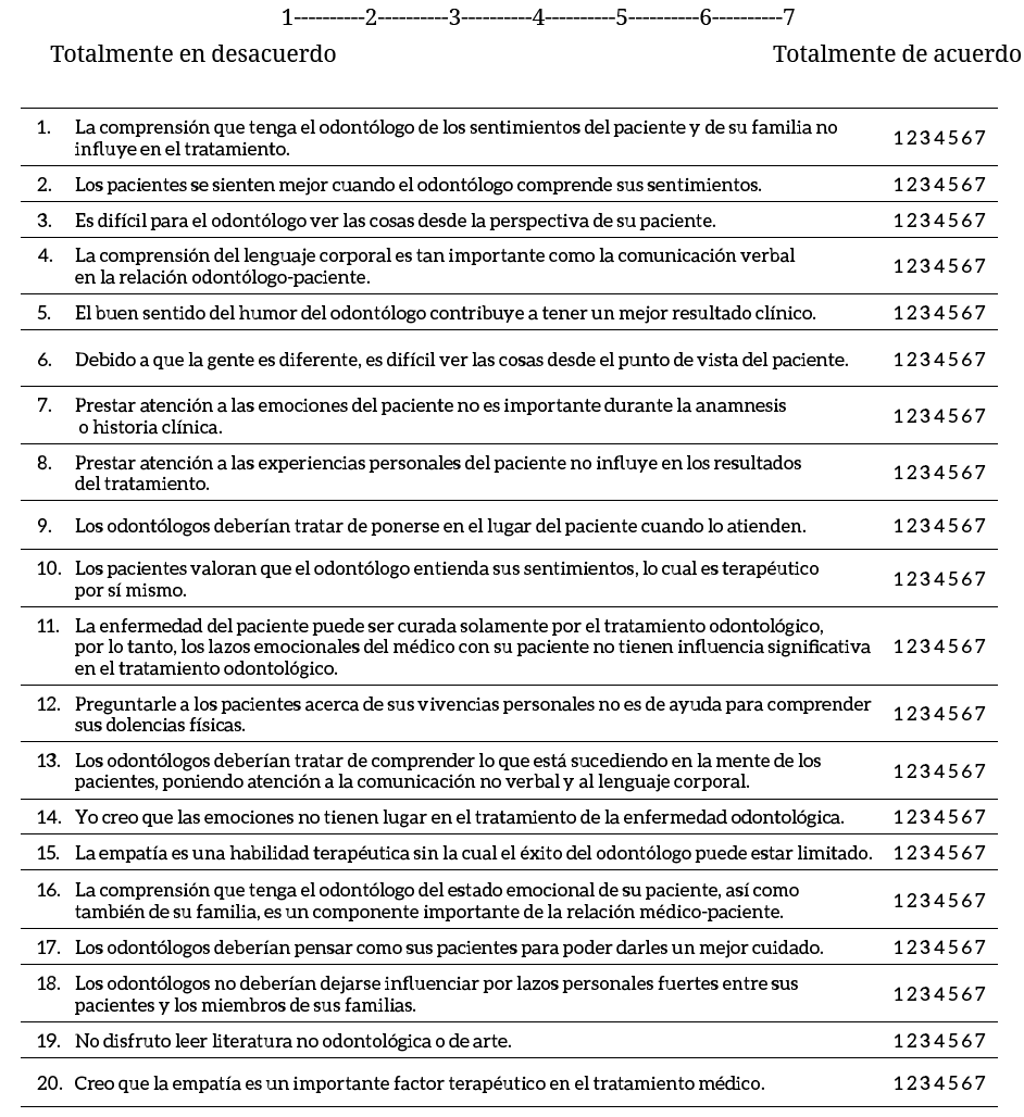 El instrumento utilizado fue la escala de Jefferson de empatía (EEMJ), se utilizó la versión en español para estudiantes de medicina (versión S), previamente validada en México y Chile y adaptada para estudiantes de odontología en Colombia (anexo A). A pesar de ser un instrumento ya validado previamente se decide realizar el proceso de validación y confiabilidad del instrumento. El instrumento fue adaptado culturalmente a Colombia mediante el método de criterio de jueces, es decir por medio de una comisión de jueces expertos, tres académicos relevantes profesionales médicos, con el objeto de verificar la validez cultural y de contenido y comprobar la comprensión del instrumento en nuestro contexto sociocultural. Posteriormente se realizó una prueba piloto en 40 estudiantes de odontología de otro programa de la misma ciudad (1, 8, 9, 13, 16).