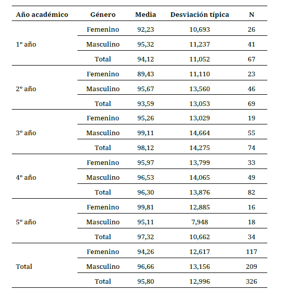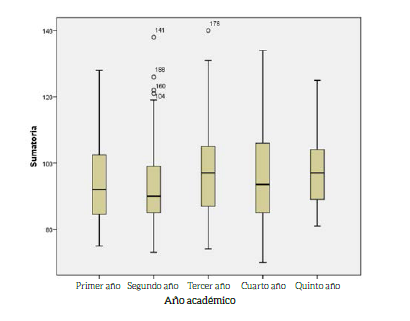 Se observan los valores de los estadígrafos descriptivos. El factor estudiado (año académico) no fue significativo (p >0,05), lo cual indica que no existen diferencias entre los cursos estudiados (p = 0,185; Anova).