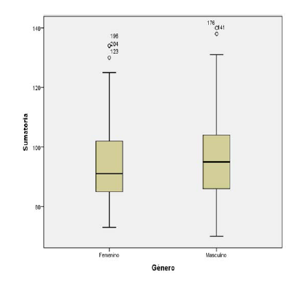 Se observan los resultados del Anova bifactorial. El factor estudiado (género) no es significativo (p > 0,05), lo cual indica que no existen diferencias entre los géneros (p = 0,25 Anova)
