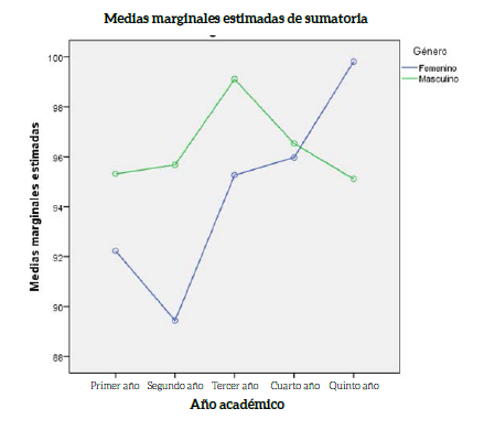 Los resultados del Anova no fueron significativos para el factor años académicos (p = 0,185), género (p = 0,25), interacción (p = 0,341). Se encontró que los valores de eta cuadrado fueron de 0,019, 0,004 y 0,014 para ambos factores, y su interacción y la potencia fue de 0,481, 0,21 y 0,356 respectivamente para ambos casos. El valor del R2 corregido fue de 0,012; los factores estudiados explican solo el 1,2% de toda la variación de la empatía. En el factor años académicos se observó, en valores absolutos, que las medias en 1º, 3º y 5º año son semejantes y se produce una disminución en el 2º y 4º año; mientras, en los géneros se encontró que el género masculino tiene valores absolutos superiores al femenino (figura 3). Sin embargo, el comportamiento de estas medias es diferente cuando se analizan los niveles combinados de ambos factores. El género femenino aumenta en forma constante en todos los años, con excepción del 2º, mientras que el masculino asciende de 1º a 3º y disminuye sostenidamente hasta 5º, con valores inferiores al femenino en este último año.
