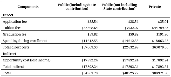 Total direct costs were calculated at US $22, 632 for students at public universities, or US $37, 070 if State contributions are taken into account, and US $63, 080 for students at private universities. Total indirect costs were US $17, 892. Thus, the cost of training a physician in Colombia is US $54, 962 at a public university and US $80, 972 at a private university.