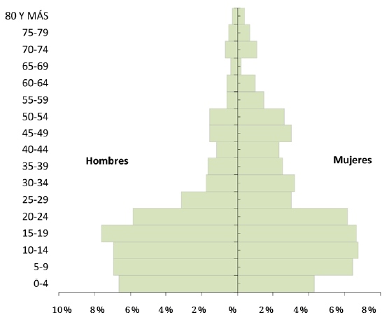 Las viviendas estaban habitadas por 1021 personas; de ellas, el 52.0 % (IC 95 %: 48.9-55.1) eran mujeres, la mitad con 19 años o menos. En general, es una población predominantemente joven, con amplia concentración de hombres y mujeres con edades entre 5 y 29 años de edad y una reducción marcada y considerable en los hombres mayores de 30 años (figura 2). El 44.7 % (IC 95 %: 41.7-47.8) de la población que reside en las VIS no había terminado estudios de primaria; el 38.9 % (IC 95 %: 35.9-41.9) se encontraba estudiando; el 26.4 % (IC 95 %: 23.7-29.1) trabajaba de manera remunerada, aunque de manera informal, y solo el 8,6 % (IC 95 %: 6.9-10.3) estaban afiliados al régimen contributivo de salud.