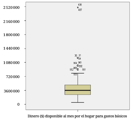 En la mitad de las viviendas, el dinero disponible al mes para gastos de alimentación, vestuario, servicios públicos, arriendo, educación, salud y recreación era de $ 360 000 o menos (figura 1). El 41.3 % (IC 95 %: 34.4-48.2) de los hogares se encontraba en condición de pobreza extrema, con ingresos inferiores a 1.25 dólares al día y 21.9 % (IC 95 %: 16.1-27.7) de los jefes de hogar realizaba actividades comerciales y artesanales en el espacio de las viviendas.