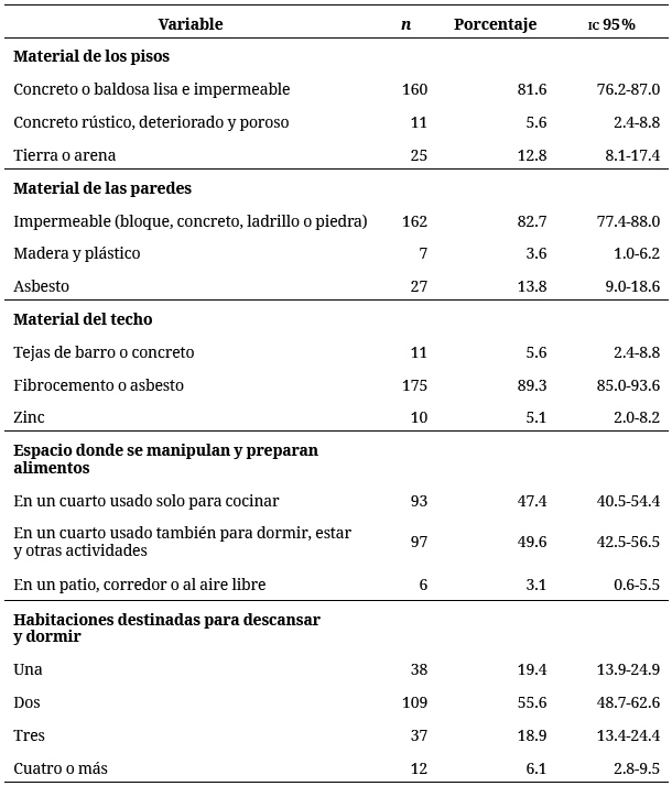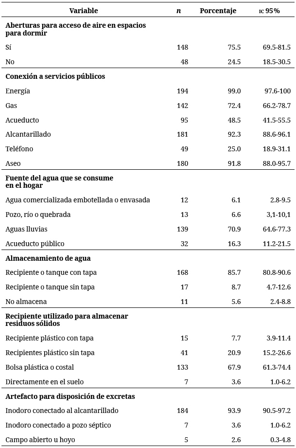 La tabla 1 presenta las condiciones de infraestructura, diseño y servicios de las viviendas. Se destaca que más del 10 % de las VIS contaba con pisos de concreto deteriorado, tierra o arena, y tenían paredes construidas en asbesto; menos de la mitad estaban dotadas con un espacio destinado exclusivamente para manipular y preparar alimentos y conexión al servicio de acueducto; y más del 60 % tenían como máximo dos habitaciones destinadas para dormir y descansar. Además, el 70.9 % (IC 95 %: 64.6-77.3) de los hogares consumía agua recolectada de lluvia y el 59.7 % (IC 95 %: 52.8-66.6) no la filtraba, no la hervía, no le aplicaba cloro ni la trataba previamente.