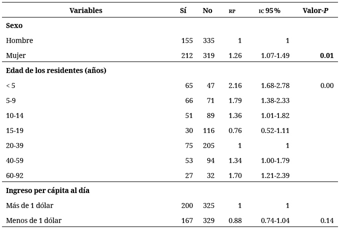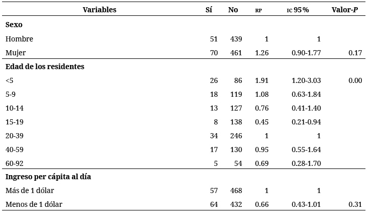 Por su parte, tras el análisis multivariado se confirmó que las mujeres tienen hasta un 24 % más de probabilidades de presentar síntomas relacionados con IRA (RP 1.24, IC 95 %: 1.05-1.47); en los menores de 5 años se duplicó la probabilidad de presentar dicho evento (RP 2.07, IC 95 %: 1.60-2.67) y en quienes tenían de 5 a 9 años aumentó en 57 % (RP 1.67, IC 95 %: 1.26-2.21) con respecto a las personas con edades de entre 20 y 39 años. Se identificó un 28 % y un 58 % más de probabilidad del evento en las viviendas que tenían piso de cemento rústico, deteriorado, con poros y grietas (RP 1.28, IC 95 %: 1.03-1.61) y en las que lo tienen de tierra o arena (RP 1.68, IC 95 %: 1.23-2.29), respectivamente, en comparación con las de aquellas personas cuya vivienda tenía piso de cemento o baldosa liso e impermeable. Del mismo modo, el hecho de residir en una vivienda con máximo dos habitaciones destinadas para descansar y dormir acrecentó en 42 % la probabilidad de padecer IRA (RP 1.42, IC 95 %: 1.05-1.91), en comparación con quienes tenían tres o más.
