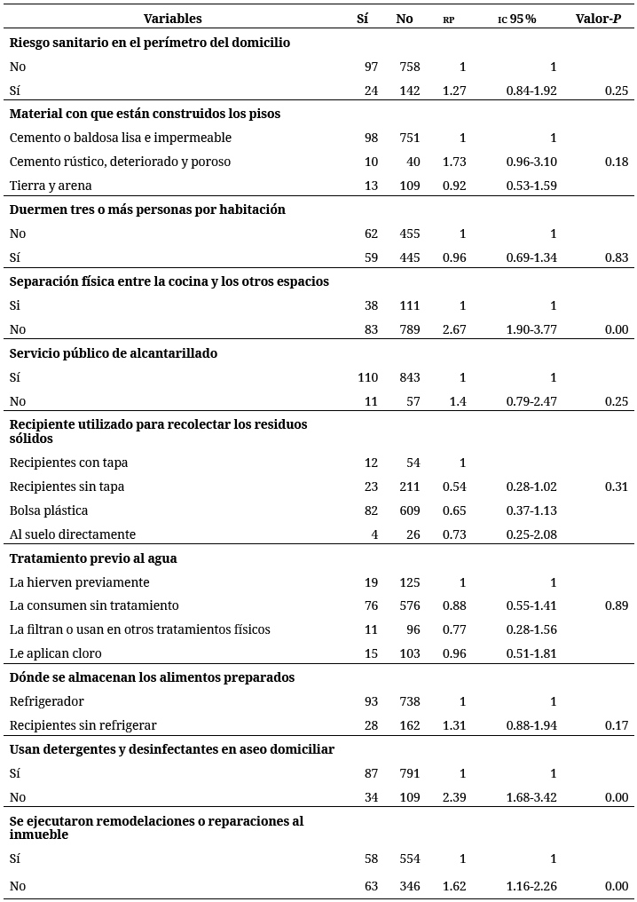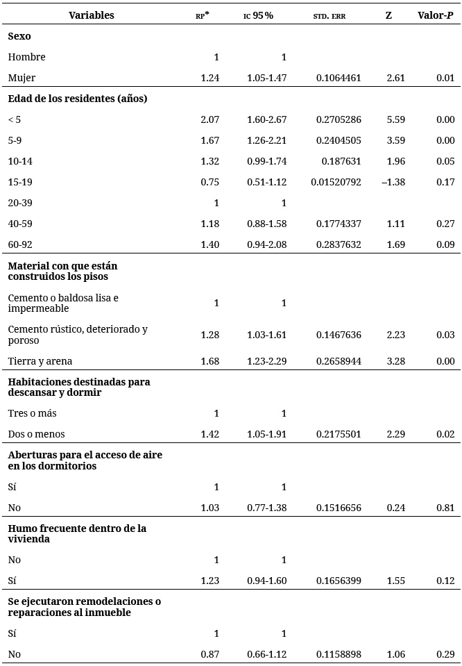 Las variables que mostraron asociación estadística significativa en el análisis bivariado o que cumplieron el criterio estadístico de Hosmer-Lemeshow (valor p menor o igual que 0.25) fueron incorporadas al análisis exploratorio multivariado, con cálculo de razón de prevalencia (RP) ajustada por el efecto agrupación; este se realizó mediante modelo multivariado de regresión binomial. Se consideraron significativas aquellas asociaciones con valor p menor o igual que 0.05. Además de este criterio estadístico, por tratarse de un estudio exploratorio, para la selección de las variables y definición de los modelos se tuvieron en cuenta los resultados de algunas investigaciones de carácter internacional y revisiones sistemáticas sobre la relación entre la prevalencia de los dos eventos epidemiológicos de interés y las condiciones habitacionales (23, 24, 25, 26).