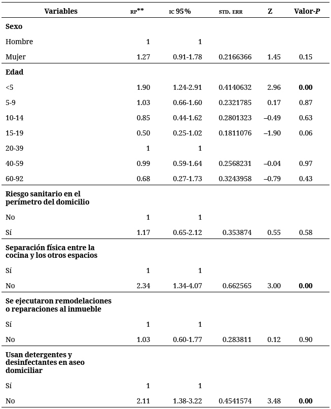 También, como resultado del análisis multivariado, se mantuvo que ser menor de cinco años aumentaba en 90 % la probabilidad de tener síntomas relacionados con EDA con respecto a quienes tenían de 20 a 39 años de edad (RP 1.90, IC 95 % 1.24-2.91). Cuando el lugar de manipulación y preparación de alimentos no estaba separado físicamente de otros espacios de la vivienda, la probabilidad de percibir síntomas del evento resultó ser el doble con relación a quienes tenían dicho espacio separado físicamente de otras zonas de la casa (RP 2.34; IC 95 % 1.34-4.07). Una situación similar se presentó en viviendas donde los jefes de hogar manifestaron no usar detergentes ni desinfectantes en las labores de aseo doméstico (RP 2.11; IC 95 %: 1.38-3.22).