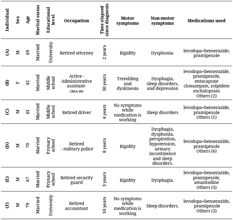 The focus group included patients with different characteristics. In order to form such a group, patients of both sexes, of different ages, and varying times elapsed since their diagnoses were invited to participate. Some of them had motor symptoms (tremor at rest, akinesia or bradykinesia, rigidity, postural instability, and gait disorders), and/or non-motor symptoms (neuropsychiatric manifestations, autonomic complications, and sleep disorders) (4, 19). Depression was identified when the patient mentioned that he or she had been diagnosed or when they had been prescribed medicines indicated for the treatment of depression. During the dispensing of medicine, patients were invited to participate in the focus group. The 6 patients who were invited agreed to participate; their characteristics are described in table 1.