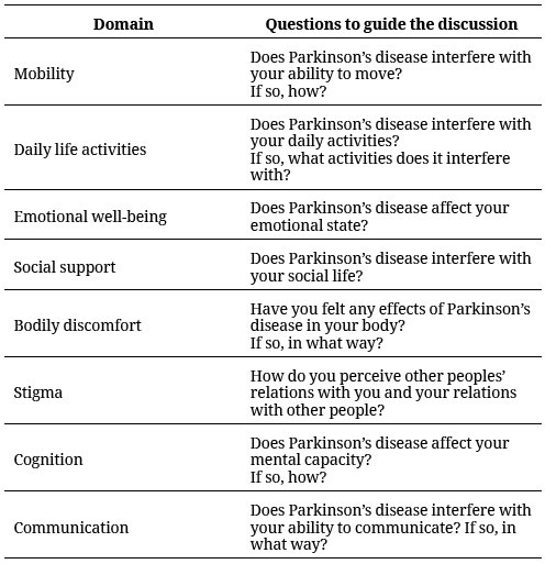 The discussion was guided with open questions that corresponded to the eight domains of the questionnaire for the evaluation of quality of life of Parkinson’s disease patients (PDQ-39) (15) (table 2). The focus group lasted about two hours. Participants were informed about the objectives of the project and told that an audio tape was being made of the discussion. All patients agreed to these conditions and signed the informed consent form before beginning their participation in the focus group.
