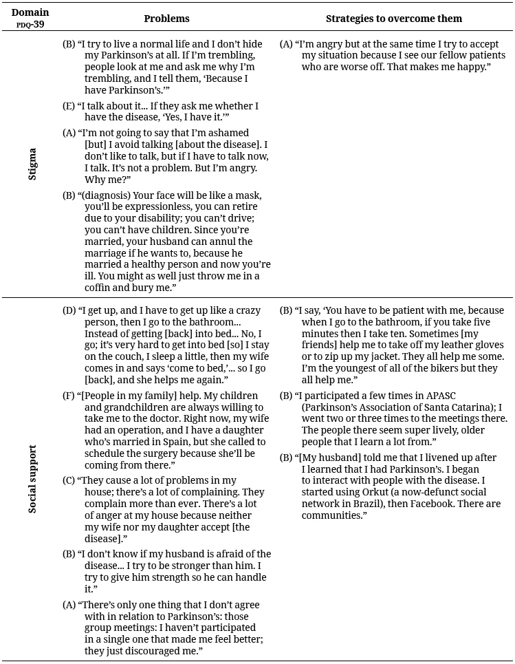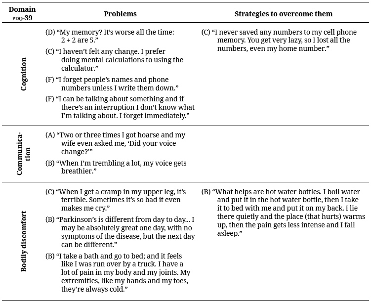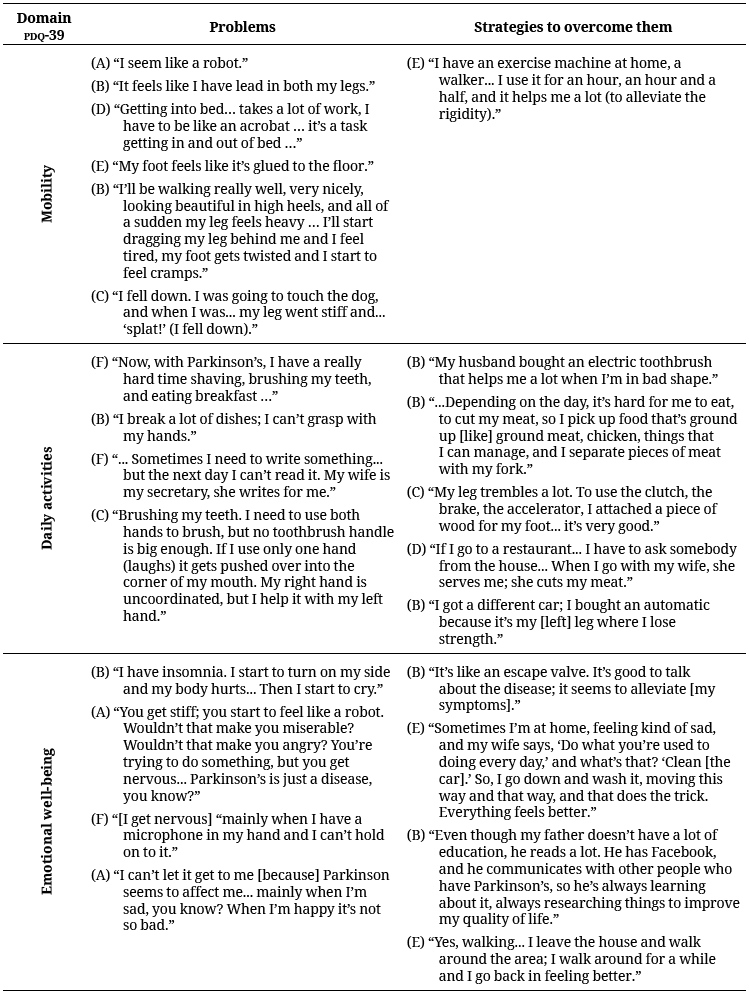 Table 3 presents excerpts that exemplify the problems identified by participants as compromising their quality of life, according to the categories mentioned on PDQ-39, as well as the strategies they used to overcome them.