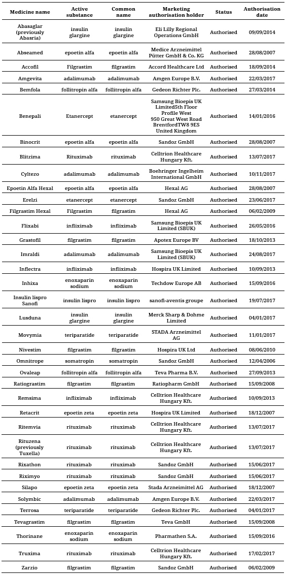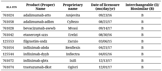 De la revisión a la información disponible en la FDA, de los 148 medicamentos biológicos aprobados a diciembre de 2017, 9 son biosimilares que se encuentran autorizados en la actualidad.