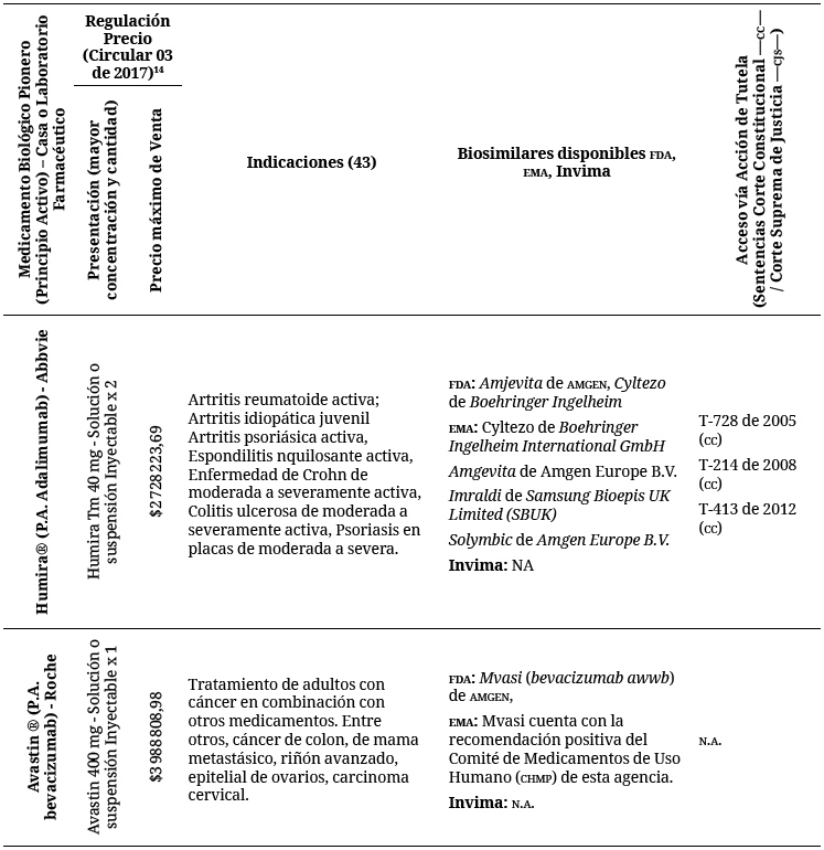 Abstract: Introduction: This article presents an analysis of biosimilar drugs in Colombia, aiming at critically analyzing whether the consumption of biosimilar drugs in Colombia is fully informed or if it rather is characterized for its lack of information. Informed consumption in the sense of taking into account the quality and quantity of the information circulating in relation to the availability and affordability (prices) of biosimilar drugs. Development: This is a qualitative documentary analysis, based on the review of databases such as Pubmed, Scopus, Scielo, Vlex and Redalyc, and sanitary databases of drug´s regulatory agencies (FDA, EMA and the Colombian Invima) and the Vademecum Med Informatica. One of the biosimilars authorized by FDA and four of those by EMA were also registered before by the Invima. However, the number of Invima authorized biosimilars is higher than that authorized by FDA and EMA. It is also important to highlight the fact that any biosimilar is not registered as such neither before the Invima nor before any other official or commercial source. Out of the biological reference products with biosimilars, twelve have regulated price and seven have been authorized at least once via court ruling. Conclusions: Although the regulations are progressive in relation to the access to biosimilars and, consequently, to their biological pioneers, the system still has legal, availability and information barriers that undermine the protection and effectiveness of the right to health.