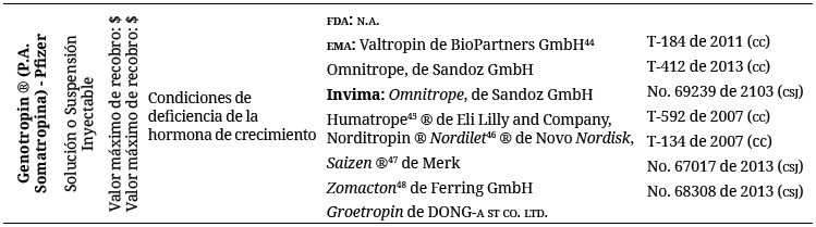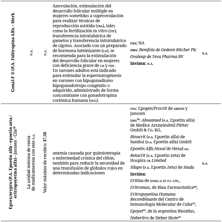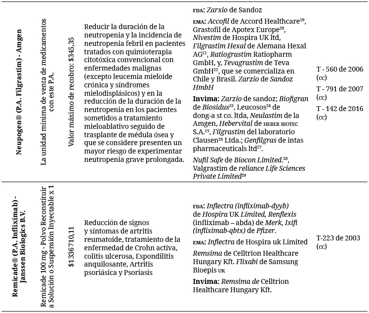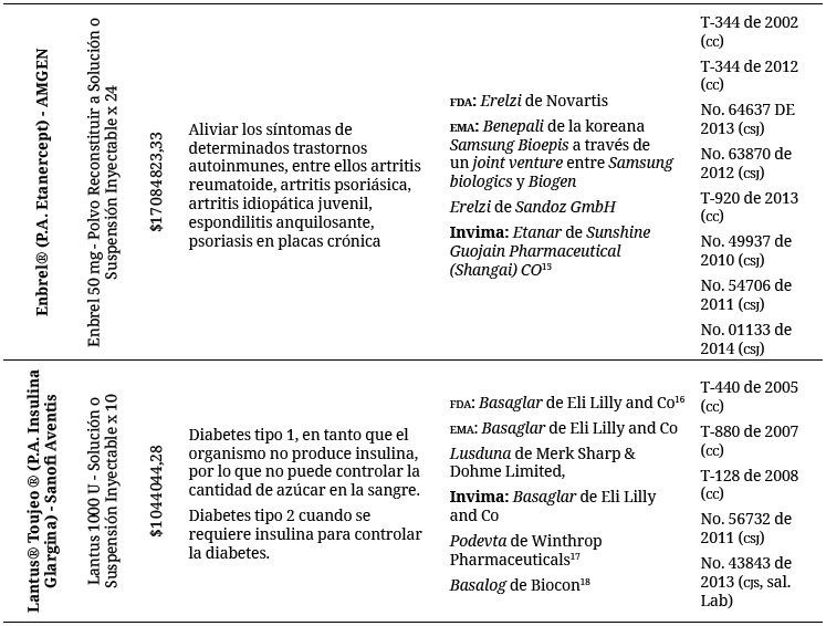 Adicionalmente, se incorporó el listado de biosimilares fabricados en la India, China, Corea y países de Latinoamérica, entre otros, y aprobados por su agencia reguladora, como quiera que se trata de un mercado que tiene un desarrollo significativo en estos países. Si bien, los biosimilares no han sido aprobados por la agencia de EE. UU. o la europea están entrando con un alto impacto al mercado de medicamentos en Latinoamérica (42).