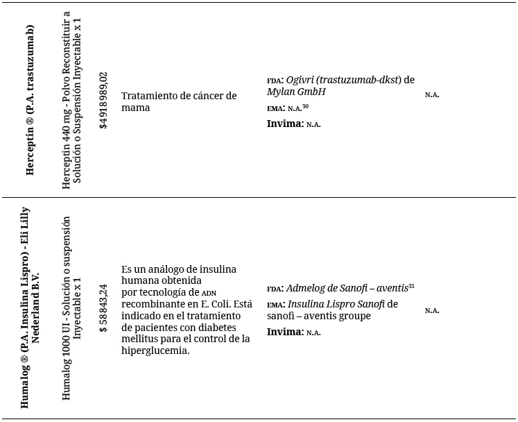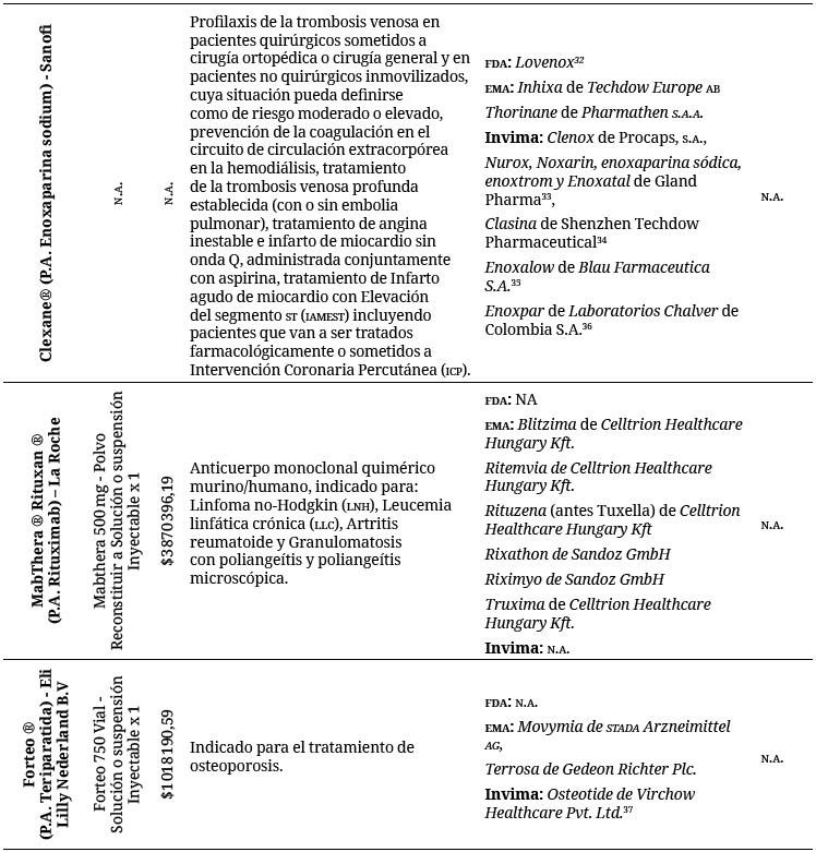 Conforme a este primer resultado, debió buscarse manualmente la información, por lo que se tomó el listado de los biosimilares aprobados por la FDA y la EMA y se contrastó con la lista general de los medicamentos aprobados por el Invima, tomando como criterio de búsqueda el principio activo del medicamento13.
