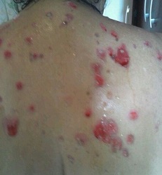 Debido al diagnóstico presuntivo de PV, se realiza interconsulta con el servicio de Dermatología de la Facultad de Medicina de la Universidad de Cartagena. En el examen clínico dermatológico se observan múltiples lesiones ampollares de contenido seroso, ubicadas en espalda, cuero cabelludo, piernas, ala nasal izquierda, hombros y ombligo. Se reporta prueba de Nikolsky positiva y además se evidencian zonas erosivas muy dolorosas a la palpación, con sangrado leve en espalda y hombros (figura 3).