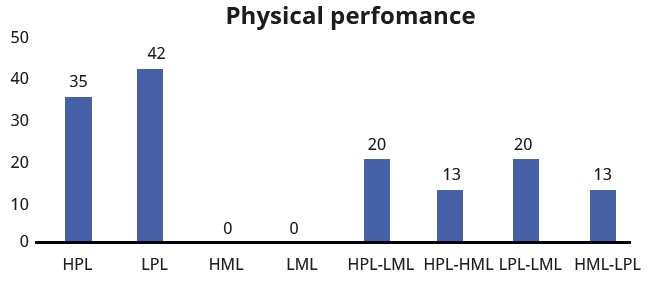 The results of physical performance showed a similar behavior when HME is not present. For example, HPE, LPE, LPE-HPE, LPE-LME scored 35, 42, 20 and 20 moves, respectively, being significantly higher than the values obtained for the remaining tests (p <0.05) (see figure 5 and table 7).