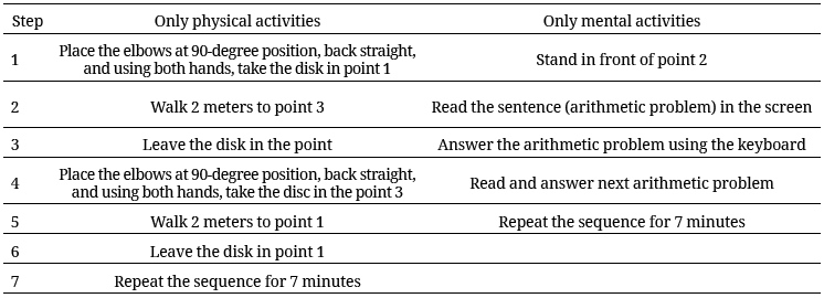 The values of four dependent variables were recorded. Heart rate (HR) was recorded using the heart rate monitor Suunto software. The physical performance was measured counting the number of times that participants moved the disc. The mental performance was measured as the ratio of the questions answered correctly divided between the number of questions answered. Effort perception was assessed using the 6-20 Borg rating of perceived exertion (RPE) (10). Participants were asked every minute during the test about their perception of global efforts performed to complete the assigned tasks (see table 1).