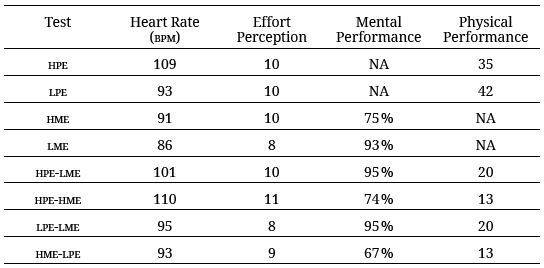 Single test HPE and the combinations HPE-LME and HPE-HME yielded the highest values of heart rate being significantly higher (p <0.05) than those that do not include HPE. In contrast, the single test LME and the combination HME-LPE got the lowest values of heart rate (see figure 2).