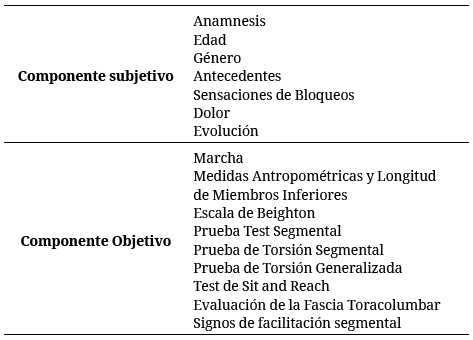 A partir de la evidencia científica, se elaboró la herramienta evaluativa que contó con una valoración subjetiva (14), dado por un interrogatorio de aspectos relevantes relacionados con la región lumbar y un componente objetivo que incluyó test clínicos específicos para el diagnóstico de las inestabilidades articulares con los test clínicos de mayor validez y confiabilidad para determinar las inestabilidades articulares de columna lumbar. Adicionalmente incluyó otras pruebas para determinar deficiencias en el sistema nervioso autónomo y miofascial (tabla 1).