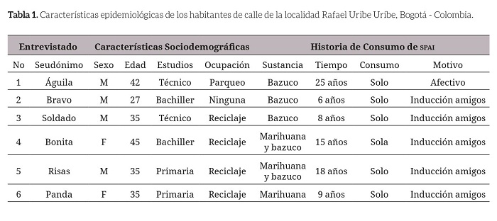 Se realizó un muestreo por conveniencia para incorporar los informantes que voluntariamente aceptaron participar previa firma del consentimiento informado. La cantidad de sujetos entrevistados se dio por la disposición de los mismos a responder las preguntas que se plantearon (41, 42). En el estudio se entrevistaron seis habitantes de calle de la localidad Rafael Uribe Uribe, dos mujeres y cuatro hombres. Las características epidemiológicas de cada uno de los participantes se refieren a continuación en la tabla 1.